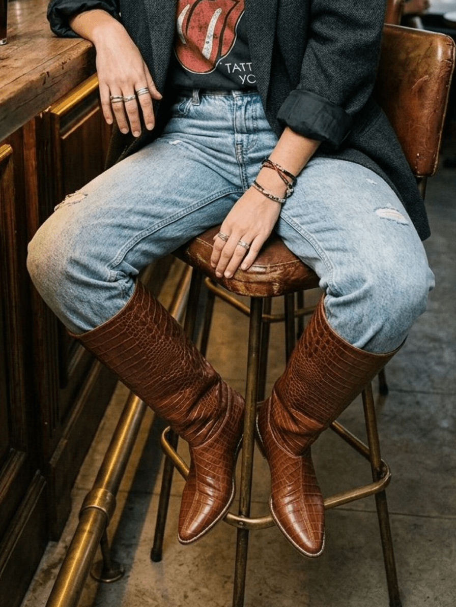 Un diseño que fusiona carácter y sofisticación en cada detalle. Estas botas están confeccionadas en cuero premium de textura natural, con una caída suave en la caña que aporta un aire descontracturado sin perder elegancia. La silueta estilizada, con punta sutilmente afinada y taco bajo de madera noble, logra el equilibrio perfecto entre comodidad y distinción. Su tono profundo realza la riqueza del material y las convierte en una pieza versátil, ideal para looks de día o de noche