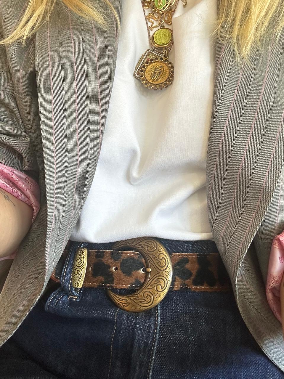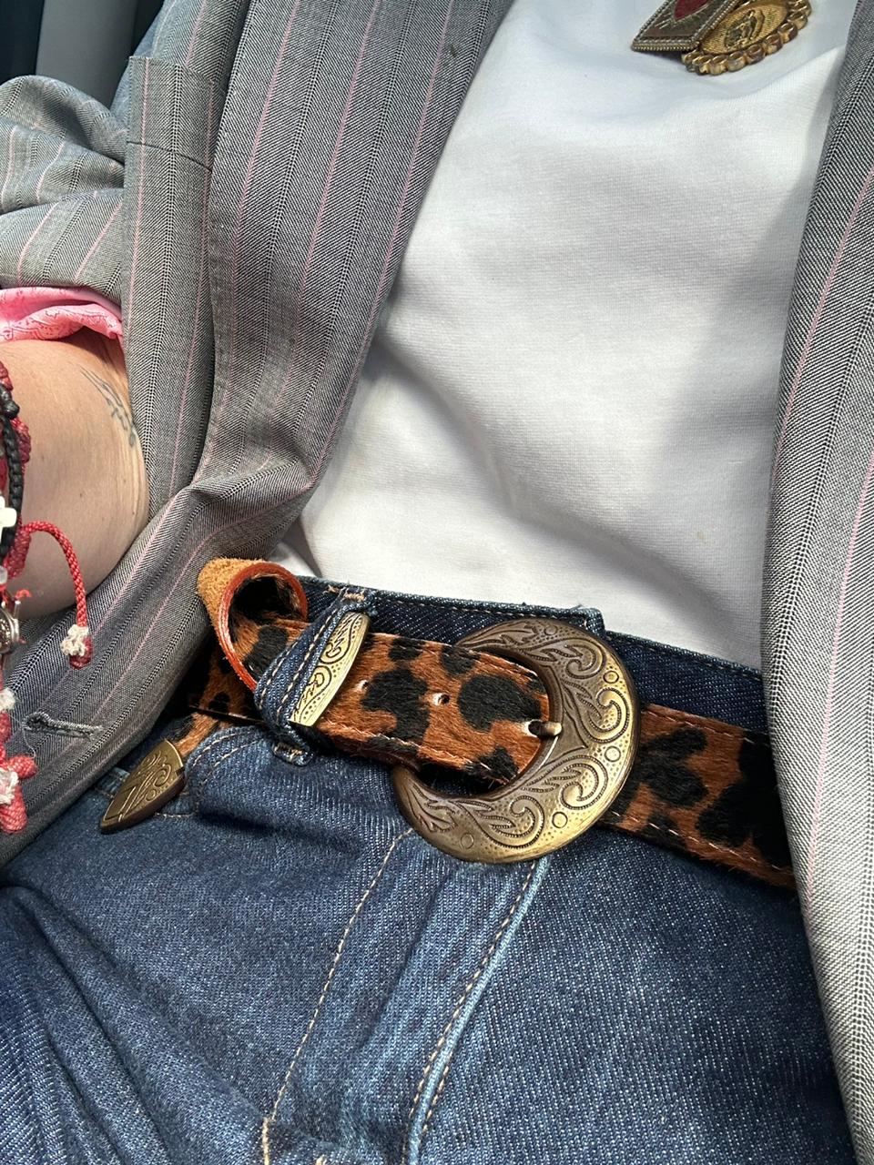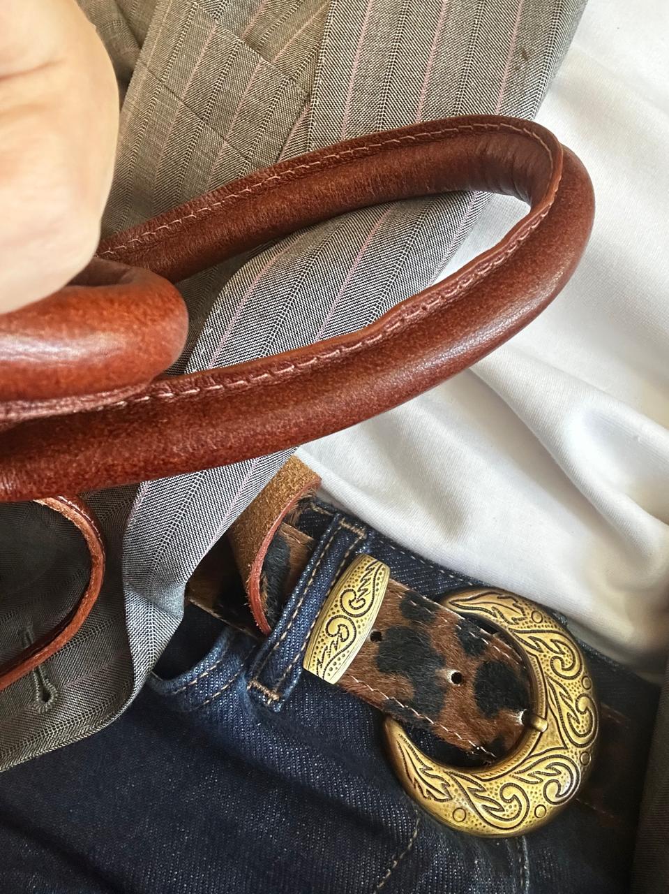 Cinto de pelo 100% vacuno forrado en gamuza con una hebilla ovalada con dibujos pampeanos que lo hacen autóctono